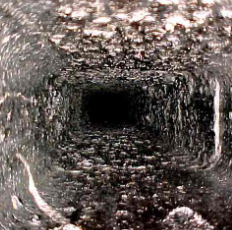 - Thick, dark deposits visible inside the flue